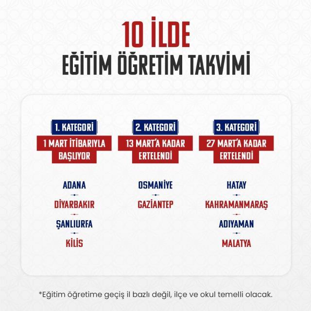 Milli Eğitim Bakanı Mahmut Özer, deprem sonrası 10 ilde 1 Mart’a kadar eğitim öğrenime ara verilmesi hakkında konuştu. Özer, “Adana, Kilis, Diyarbakır ve Şanlıurfa’da 1 Mart itibarıyla eğitim başlıyor. Gaziantep ve Osmaniye’de eğitim öğretime verilen arayı 13 Mart’a kadar uzattık. Adıyaman, Malatya, Kahramanmaraş ve Hatay’da eğitim öğretime verilen ara ise 27 Mart’a kadar uzatıldı.” dedi.