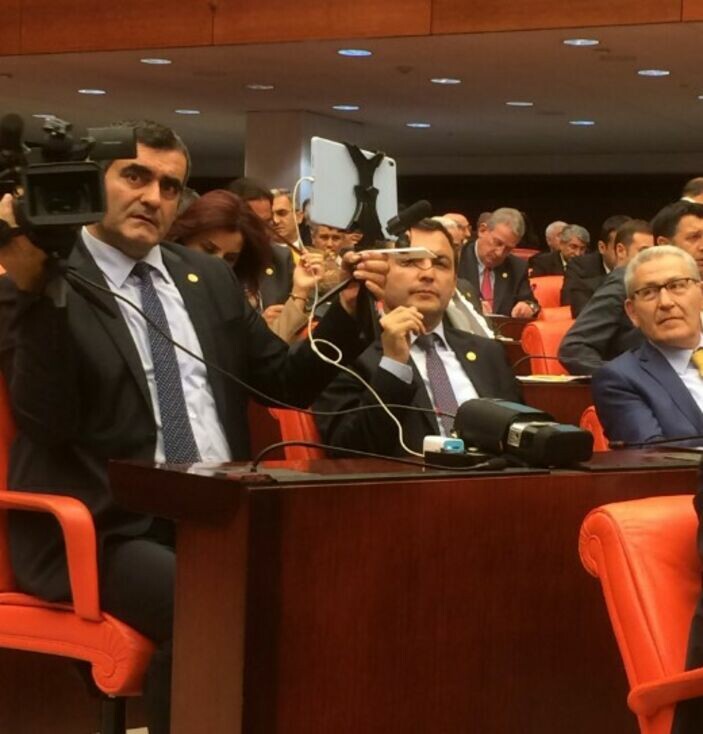 Ali Şeker, canlı yayın yapabilmek için profesyonel kamera, akıllı telefon, tablet bilgisayar ve ekipmanlarıyla Meclis’e adeta canlı yayın üssü kurmuştu.