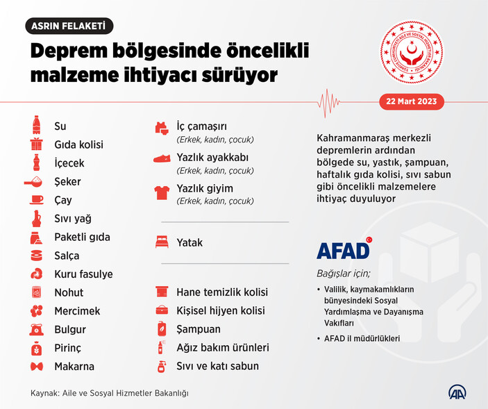 Deprem bölgesinde su, haftalık gıda ve kahvaltılık kolisi, salça, yastık, şampuan, yatak, pirinç, makarna, katı ve sıvı sabun, paketli gıda, ağız bakım ürünleri ile erkek, kadın, yaşlı, çocuk kıyafeti ve yazlık ayakkabının, öncelikli ihtiyaç duyulan malzemeler arasında olduğu belirtildi.