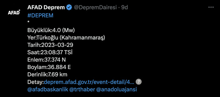 Afet ve Acil Durum Yönetimi Başkanlığı depremin 7.69 kilometre derinlikte olduğunu açıkladı.