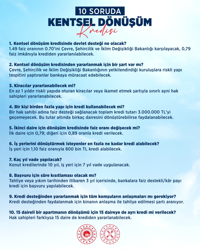 Hazine ve Maliye Bakanlığı, Twitter hesabından, 10 soruya verdiği cevaplarla paketin merak edilen yönlerine açıklık getirdi. Çevre, Şehircilik ve İklim Değişikliği Bakanlığı ile hazırlanan “Kentsel Dönüşüm Kredi Paketi”nden kimlerin nasıl yararlanabileceğine, vade ve faiz oranlarından kiracı ve iş yerlerinin durumuna kadar detaylar paylaşımda yer aldı.