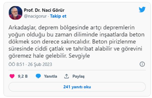 Görür’ün Twitter’dan paylaştığı mesaj şöyle: “Arkadaşlar, deprem bölgesinde artçı depremlerin yoğun olduğu bu zaman diliminde inşaatlarda beton dökmek son derece sakıncalıdır. Beton pirizlenme süresinde ciddi çatlak ve tahribat alabilir ve görevini göremez hale gelebilir.”