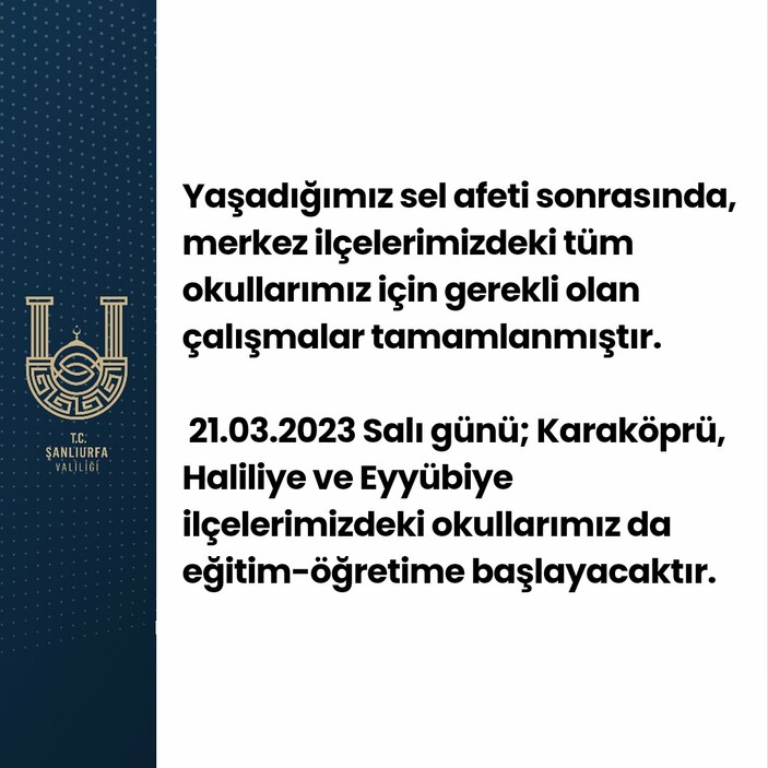 21.03.2023 Salı günü; Karaköprü, Haliliye ve Eyyübiye ilçelerimizdeki okullarımız da eğitim-öğretime başlayacaktır.