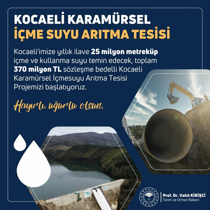 İhsaniye Barajından, Kocaeli’nin Gölcük ve Karamürsel ilçeleri ile bu iki ilçe arasındaki sahil şeridinde yer alan yerleşimlere sağlıklı içme ve kullanma suyu sağlayacak, 370 milyon TL bedelli projemizi başlatıyoruz.